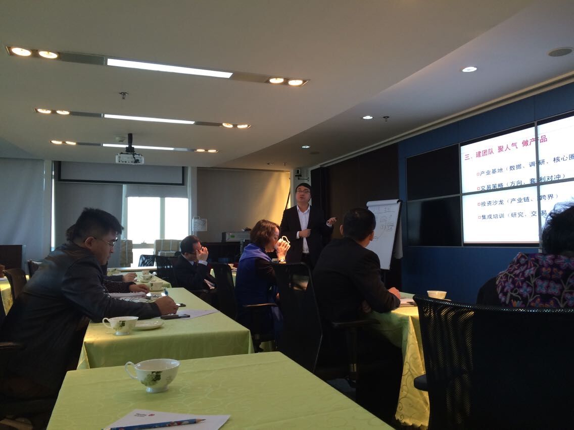 随后,拟任业务副总对公司2015年业务目标进行了分解,并结合市场各种业务创新模式进行了详细的讲解,对风险管理子公司业务、资产管理子公司业务、资金合作业务等创新业务进行梳理。提出建立以期货资管业务为核心的大平台,整合银行、券商、信托、第三方投顾等各方资源,兼顾主动管理、通道业务。