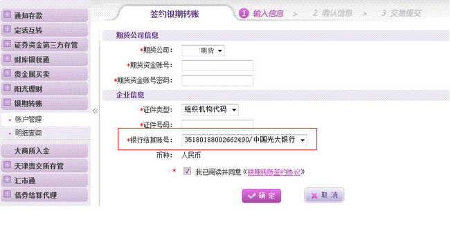 4.客户点击下拉菜单,选择所需签约的“期货公司”,填写“期货资金账号”、“组织机构代码”,点击下拉菜单,选择“银行结算账号”,点击并阅读《银期转账签约协议》,打“√”,点击“确定”
