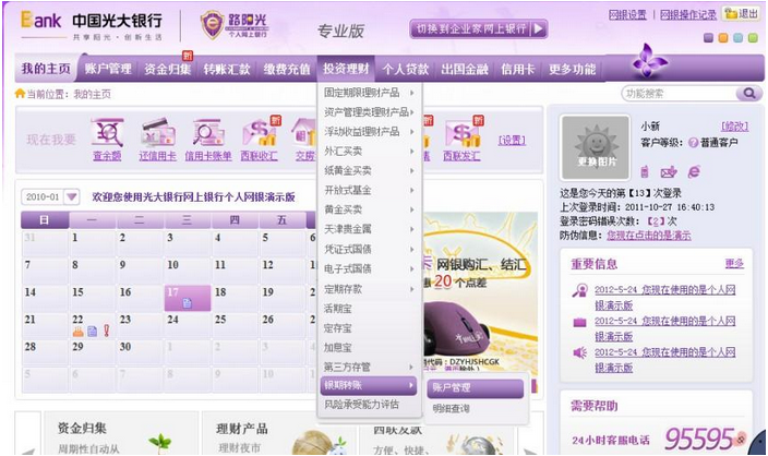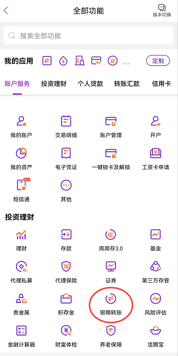 2.进入投资理财下的银期转账,进入银期转账下的账户管理