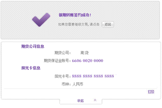 6.点击账户管理菜单,若已签约完毕,账户列表会展示阳光卡号、期货公司、期货保证金账号、币种和操作功能(包括银行转期货、期货转银行、查询当日期货资金)