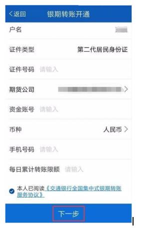 5. 输入银行卡取款密码、期货公司资金密码,点击获取短信密码。输入短信密码后,点击下一步