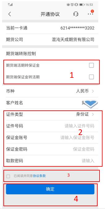 5.勾选期货端转账控制下的两个“□”,并输入证件号码、保证金账号(客户号)、保证金密码(资金密码)、招行取款密码,勾选“已阅读并同意协议条款”,点击“确定”按钮。