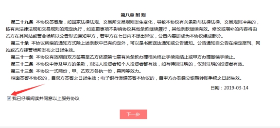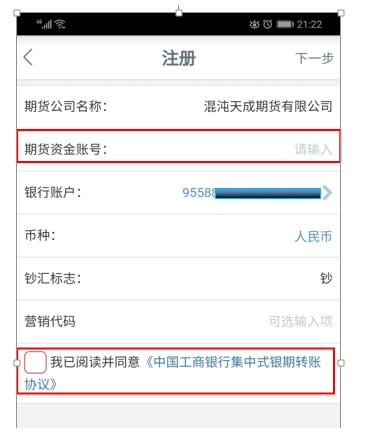5.输入期货资金账号,勾选 “我已阅读并同意”,点击下一步办理