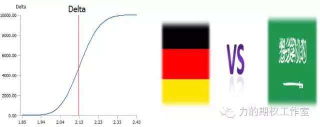 这就好比2002年世界杯,德国队和沙特队的足球比赛。有一张足球彩票,如果德国队获胜超过3球,每多赢一个球就给多给彩票持有人1元的奖金。当德国大比分(8:0)领先沙特时,几乎可以确定德国队能够以3球以上的比分战胜沙特队。那么,德国队每再进1球,彩票的价值就会上升1元。彩票的Delta接近于1。反之,如果下注沙特赢,这张彩票就一文不值。因此,此时比分的小幅变化不会改变比赛的结果,此时,彩票的Delta接近于零。