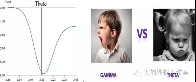 接下来,我们来聊一聊Theta。Theta衡量的是期权时间价值的损耗。对于大多数期权而言,随着距到期日的临近,期权的时间价值也会不断损耗。因此,大多数期权的Theta是小于零的。正因为期权的Gamma和Theta大部分情况是反号的,所以在期权价格的五个孩子中,我们可以把Theta和Gamma理解成总是一对死对头,你要往左我偏要往右,永远拧着来。