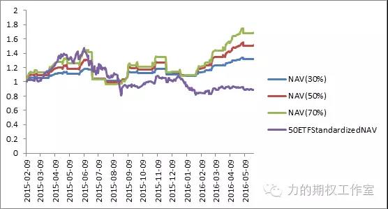 看到这里,或许您会发现,没错!卖认沽虽然赚钱胜率高,但亏起来不得了(比如去年7.23—8.26期间单张认沽亏损6328元),然而您没有想过止损吗?如果设置一个合理的止损点(比如股价日内跌2-3%就平仓),长期来看,依然是一个胜利者的姿态(关于带止损的卖认沽,可参考《窄幅震荡的L型行情,还能投资什么呢?——论会卖期权的重要性》),从2015.2.9—2015.5.31,在设置了一定止损点位后,画出卖出平值或虚值1档认沽的净值图。