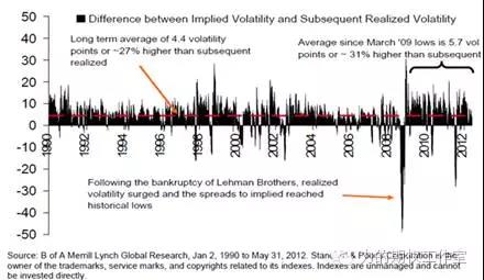 然后,我们从第三个角度——“隐含波动率”来看。我经常把隐含波动率比作是期权的“PE(市盈率)”,实际上期权是没有市盈率一说的,这样的比喻只是想说明隐含波动率是期权价格高估与否的一个指标(这一点正如市盈率之于股票),隐含波动率高于此后的实际波动率则代表该期权合约的价格是被高估了。根据标普500指数在1990.1—2012.5的数据显示,即使在发达成熟的美国市场,期权合约的隐含波动率仍然在大部分时间内都大于此后的实际波动率,这说明不论是认购还是认沽期权,期权的市场价格往往被“高估”。对于总是被高估的期权,您说卖划算还是买划算呢?答案不言自明了吧!