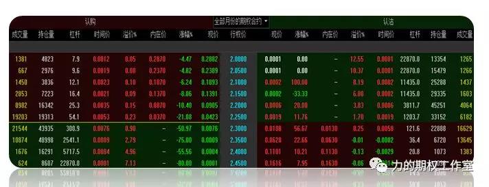对于T字报价,大家只要记住一点,上图的中间这一列是行权价,自上而下行权价由低到高排列,左边的报价都是认购期权,也就是看涨期权,右边的报价都是认沽期权,也就是看跌期权。如何在T字报价里区分实值期权和虚值期权呢?上图中,从左到右的第六列是内在价值,有些单元格的内在价格有数字,比如第一行是0.2870,第二行是0.2370,但是最下面四个单元格是空值。