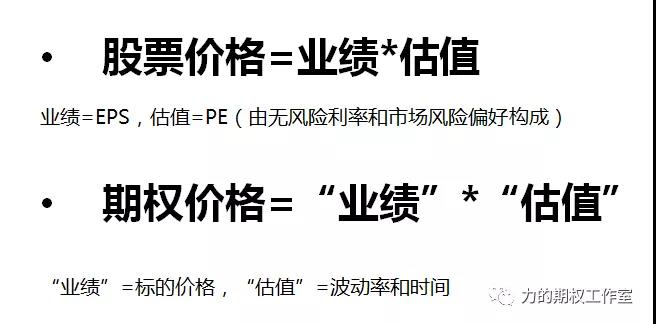 我们再来看一个比喻。很多人把期权价格说的很复杂,很多做市商在谈期权价格的时候,会谈到BS、BS76、hasten模型等常用的估值方法。其实可以通过上图所示的公式来通俗的解释期权的价格。期权和股票的价格有相通之处。股票的价格等于业绩乘以估值,这是一个经典公式。业绩往往用每股盈利(也就是EPS)来衡量,而估值就是市盈率,用PE来衡量。市盈率又分成无风险利率和市场风险偏好两部分的。