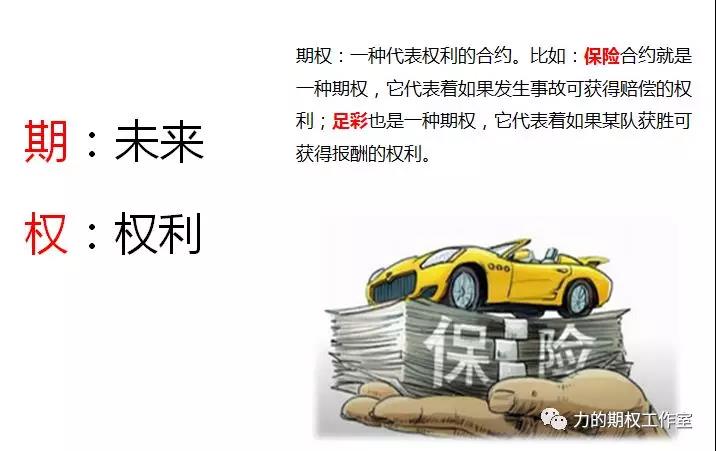 首先我们来看期权交易里必须知道的名词。第一个是期权,顾名思义,期代表未来,权代表权利,所以期权两个字代表未来的权利。期权中的第一个比喻就是把期权看成是保险。期权费的英文是optionpremium,而premium就是保险费的意思。国外很多交易商都把期权看成是保险。外汇期权就是外汇汇率上的保险,大宗商品期权就是为企业锁定买入价和卖出价,用来套保的保险,股票期权、ETF期权就是针对权益类市场的一个保险。