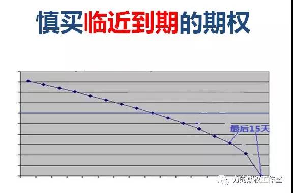 第一个期权交易的风险叫做慎买临近到期的期权。下图是期权时间价值的衰减图,期权的价值等于业绩加上估值,业绩是内在价值,而估值就是时间价值。时间价值有一个特征或者口诀叫做天天贬值、越贬越快。通常来说,买一个一个月后到期的期权,它的时间价值衰减非常缓慢。买一个两周后到期的期权,它的时间价值开始加速衰减,距离到期还剩一周的时候,它的时间价值会像阳光下的冰一样溶化的非常快,而且越来越快。做期权交易,我们要尽量避免购买那些还剩下一周甚至只剩下三四天的期权,购买这样的期权,一定会在时间价值上发生巨大的亏损,如果内在价值没有明显的提升,整体的权利金一定亏损。