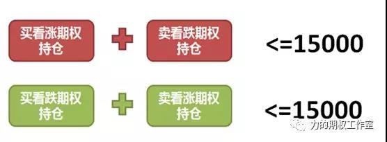 对于同一个月份的期权,所有买入看涨期权和卖出看跌期权代表看涨方向,它们的持仓之和不能超过15000手;所有买入看跌期权和卖出看涨期权代表看跌方向,它们的持仓之和不能超过15000手。