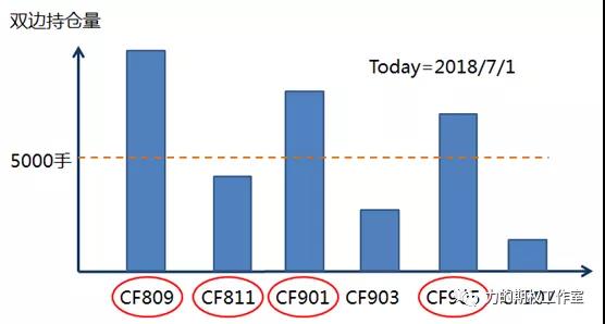 举个简单的例子,假设今天是2018年7月1日,那时市场上存续的棉花期货一共就是六个:CF809、CF811、CF901、CF903、CF905、CF907。由于CF809和CF811合约离得最近,所以市场上就会挂着CF809和CF811两个月份的期权。当CF901、CF903、CF905、CF907四个月份中哪个期货的双边持仓量超过了5000手,它对应月份的期权就会在下一交易日上市。下图会有助于您的理解: