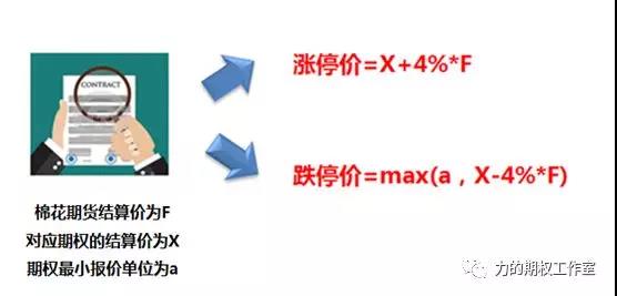 棉花期权也有涨跌停价格。在《通知》中,棉花期权的涨跌停幅度和对应标的期货的涨跌停幅度设计为一致,都是4%,举个栗子!!!