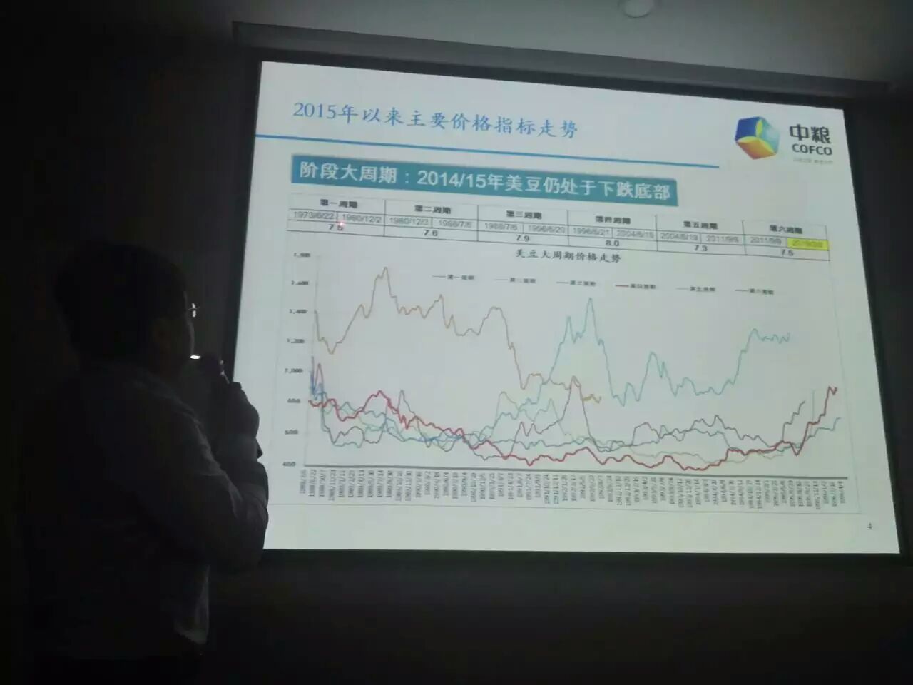 中粮集团油脂部农产品分析师任杰做了题为《2015/16年度油脂油料市场分析及展望》的演讲。任杰首先分析了2015年以来市场主要价格指标,他把1973年以来的大豆行情按7.3-8年时间段分为了六个周期,目前处于第六周期的演进阶段,还未结束。马来棕榈油9月前也在下跌,之后因减产预期及汇率因素出现反弹。然后他对市场供求形势做了分析和展望,南美增产后,美国又逢增产大周期,基因技术+天气理想导致单产提高至48.3蒲/英亩,美国供应压力突显,而国内需求+出口均不给力,5亿蒲的库存给CBOT大豆持续压力, 2014/15年国内豆粕消费超预期因蛋白需求尚好+替代杂粕和玉米消费。随后他对市场上关于阿根廷政策变化和几个品种的反倾销限制政策等热点问题了深度解读。最后他对明年油脂油料市场状况做了展望。任杰的演讲,数据详实,逻辑清晰,听众受益匪浅并主动提出问题向他请教。